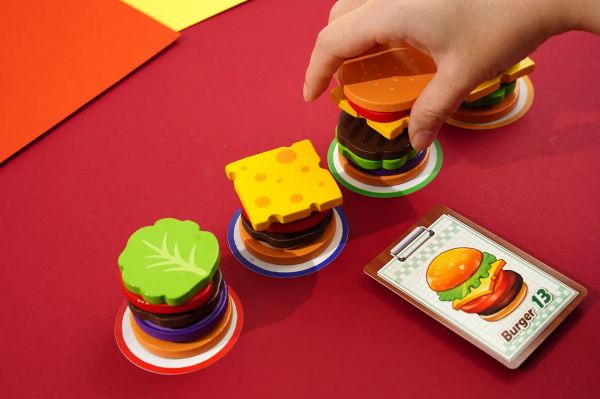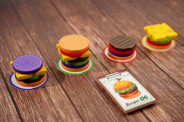 In Burger Master, use your bid cards to bid the number of "steps" it will take to form the burger exactly as it appears on the card. Wooden burger pieces start the round stacked in three piles, and a step takes place when a player flips the pieces in one stack, moves one or more pieces to another stack, or does a combination move.Burger Master features multiple levels of difficulty and solitaire play.