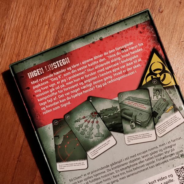 With trembling hands and tears in your eyes, you open the sealed cardboard box. ”Day 8,” as your sister called it. ”If you don’t hear from me every week, then I’m in trouble.” She never revealed what her mission was, but she’s a researcher specializing in biological warfare agents for the Armed Forces and the fear in her eyes was unmistakable. This time there was something out of the ordinary. What has happened and how can you help her? Go on a rescue mission in the role of Sigrid.
